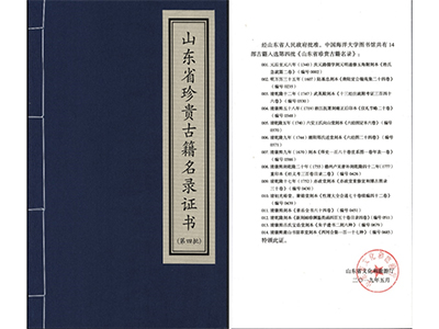 2019年被评为山东省古籍重点保护单位,藏有古籍971种12917册,其中善本105种2077册,已有35种入选第二至四批《山东省珍贵古籍名录》。重点围绕海洋特色补充新整理出版的涉海古文献及古舆图,旨在支持学校教学、科研。图书馆六楼设有历史文献阅览区,面向学校教师、相关专业研究生提供闭架阅览服务。
