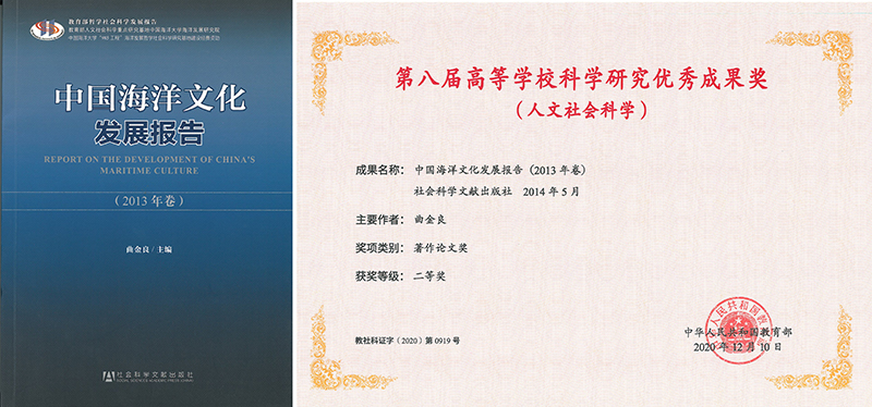 曲金良教授主编的《中国海洋文化发展报告(2013年卷)》荣获教育部第八届高等学校科学研究优秀成果奖(人文社会科学)二等奖