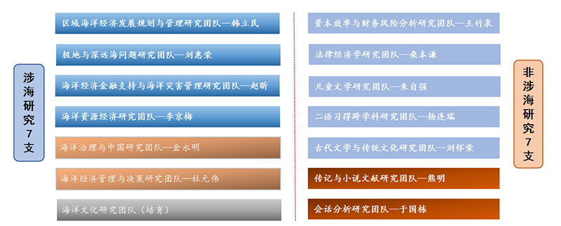 学校启动人文社科重点研究团队建设工作,将其作为推动人才培养、学科建设、科学研究、智库建设等各项工作的重要手段,经过5年的迭代与发展,目前重点建设14支团队,其中涉海团队和非涉海团队各7支。