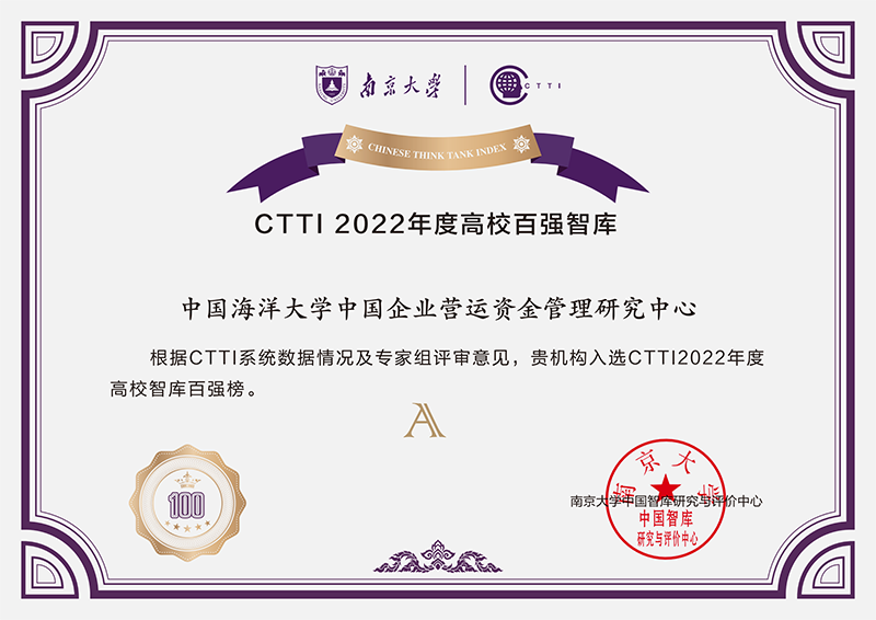 中国企业营运资金管理研究中心2022年入选中国智库索引(CTTI)高校智库百强榜(A级)