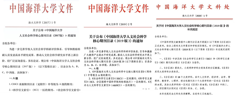 2017版开云电竞网址人文社会科学核心期刊目录(左),2019版开云电竞网址人文社会科学核心期刊目录(中)及补充规定(右)