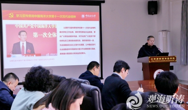 刘健从深刻理解和准确把握学校第十一次党代会报告的精神实质和科学内涵两个方面向全体教职工展开宣讲。他首先详细阐述了学校第十一次党代会的召开背景和大会主题、学校第十次党代会以来取得的重要成就和“七个始终坚持”的经验启示、学校新时代新征程新的光荣使命、学校今后五年实施好新时代海大工程的重点任务部署、实施新时代党建领航工程以加强党的全面领导和党的建设等内容。随后,他结合文新学院共工作,从“聚焦学习贯彻,提高政治站位”“聚焦党建领航,把准办学方向”“聚焦发展提速,凝聚奋进力量”“聚焦建设攻坚,锚定一流目标”“聚焦人文化成,助力人文振兴”五个方面,具体阐述了学院下一步深入学习贯彻党代会精神的举措,号召全体师生将思想和工作统一到学校党代会精神上来,深学笃行党代会精神,谱写海大人文新篇章。