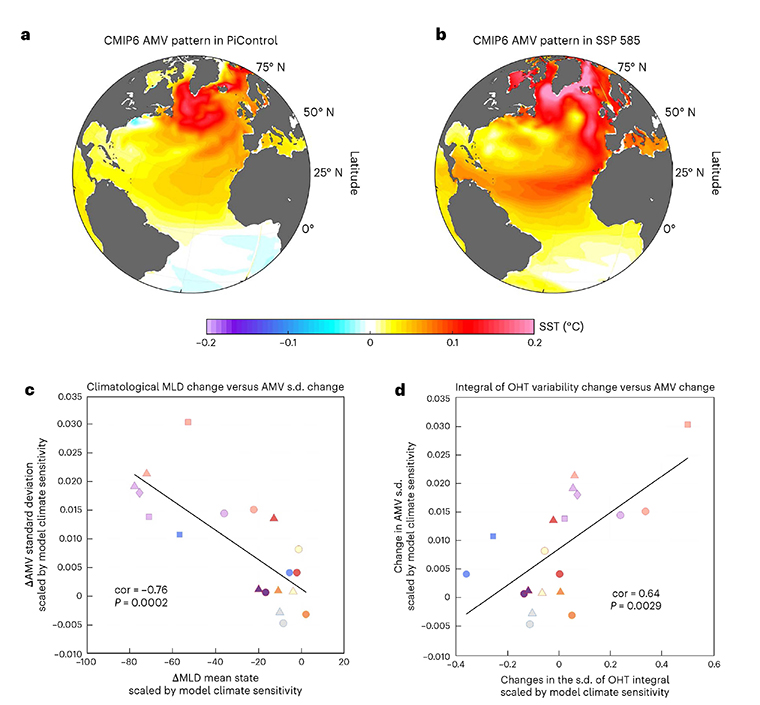 图1. 全球变暖下AMV变率的增强响应及机制。(a)AMV在变暖前PiControl情景下的空间形态。(b)AMV在变暖后SSP585情景下的空间形态。(c)全球变暖下海洋混合层平均态变化和AMV标准差变化的模式间关系;负相关表明全球变暖下海洋混合层变得越薄,AMV振幅增加越多。(d)全球变暖下海洋热输运强度变化和AMV标准差变化的模式间关系;正相关表明全球变暖下海洋热输运越强,AMV振幅增加越多。