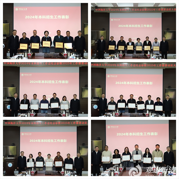 本科生招生办公室主任王宇龙宣读《关于表彰2024年度本科招生宣传工作先进集体和先进个人的决定》。海洋与大气学院等11个学院获评本科招生宣传工作卓越组织集体、化学化工学院等12个学院获评本科招生宣传工作优秀组织集体,55人获评本科招生宣传工作先进个人,张峻峰和刘勇为受表彰的卓越组织集体和先进个人代表颁奖。