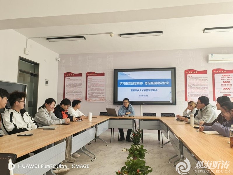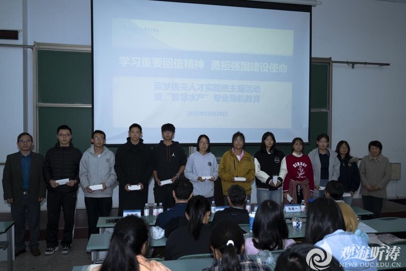 本站讯 10月26日上午,崇本学院在崂山校区举办蓝梦拔尖人才实验班“学习重要回信精神勇担强国建设使命”主题教育实践教育活动暨“智慧水产”学业导航讲座,在理论学习与学科解读的深度融合中,为新生筑牢思想根基、明晰成长路径。水产学院副院长高勤峰,水产养殖系副主任、蓝梦拔尖人才实验班学业导师唐小千,海洋渔业系副主任徐宾铎,蓝梦拔尖人才实验班班级导师王巧晗,水产养殖学专业博士研究生马超一受邀与2025级蓝梦拔尖人才实验班全体新生共同参会。活动由蓝梦拔尖人才实验班辅导员吕朋主持。