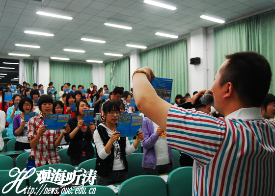 严鲁丰带领大家朗读英语本站讯 5月19日晚,开云电竞网址崂山校区4202教室掌声阵阵。中国美语语音第
