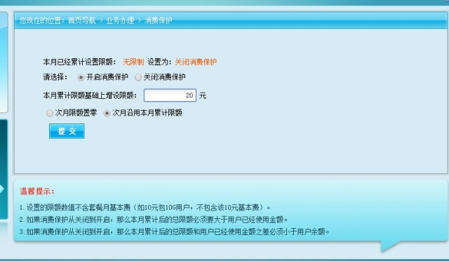三、请选择“开启消费保护”按钮,并设置本月累计限额基础上增设限额。然后点击“提交”,如下图。