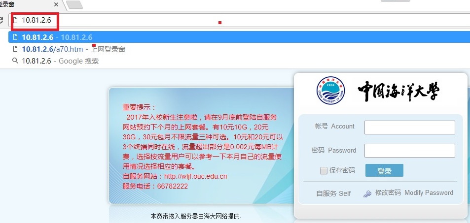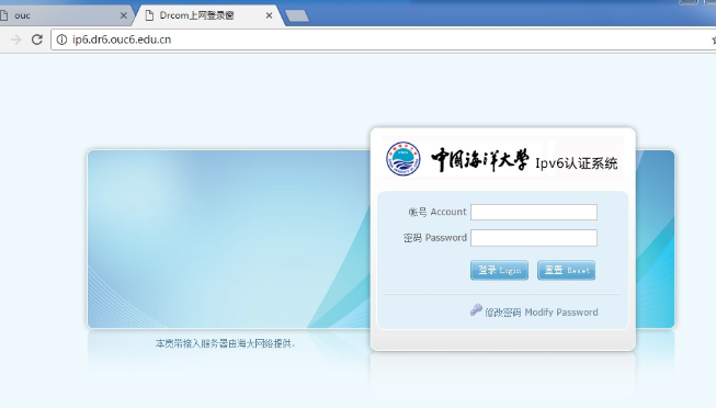 方法二:在浏览器下直接输入认证网址:http://ip6.dr6.ouc6.edu.cn/即可。如下图: