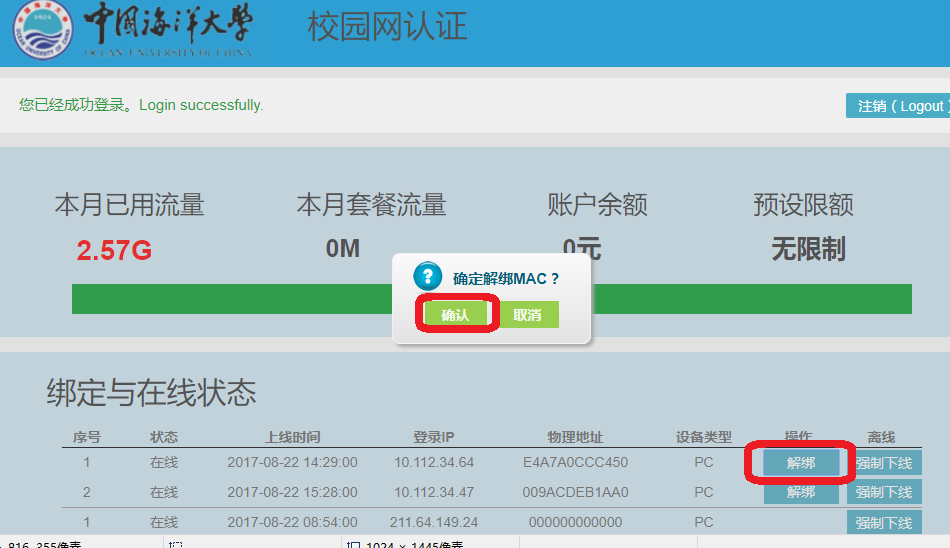 浏览器(推荐使用chrome、ie)地址栏输入:http://10.100.29.2,打开认证成功页面。找到需要解绑定的mac地址,点击“解绑”按钮,系统会提示“确定解绑mac?”,点击“确定”即可。