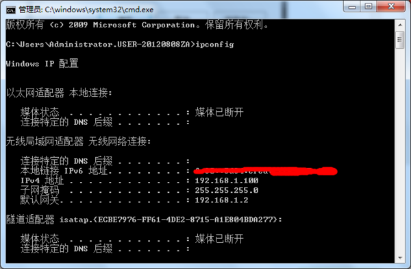 调出cmd命令框后,输入命令: ipconfig 按回车键运行