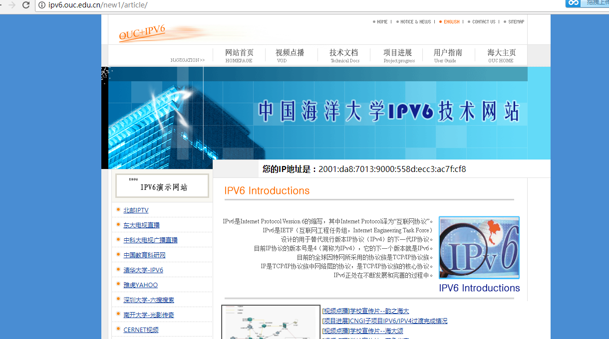 方法一:在浏览器地址栏输入网址“http://ipv6.ouc.edu.cn/”,如果弹出如下页面,那么恭喜啦,您的ipv6协议已安装。