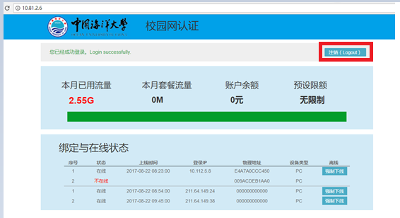 在浏览器窗口输入:http://10.81.2.6,即可弹出登录成功页面,点击“注销”可以注销账号认证。如下图: