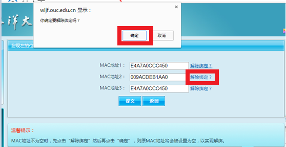 第三步:找到需要解除绑定的mac地址,点击mac地址后的“解除绑定?”按钮,会弹出提示“你确定要解除绑定吗?”,点确定即可。