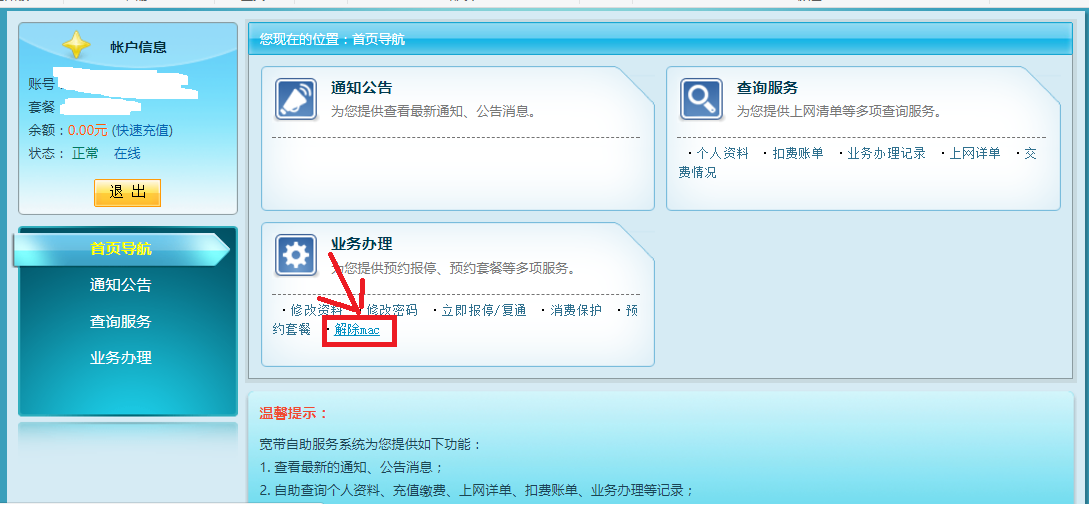 第二步:在“业务办理”栏目下点击“解除mac”,如下图: