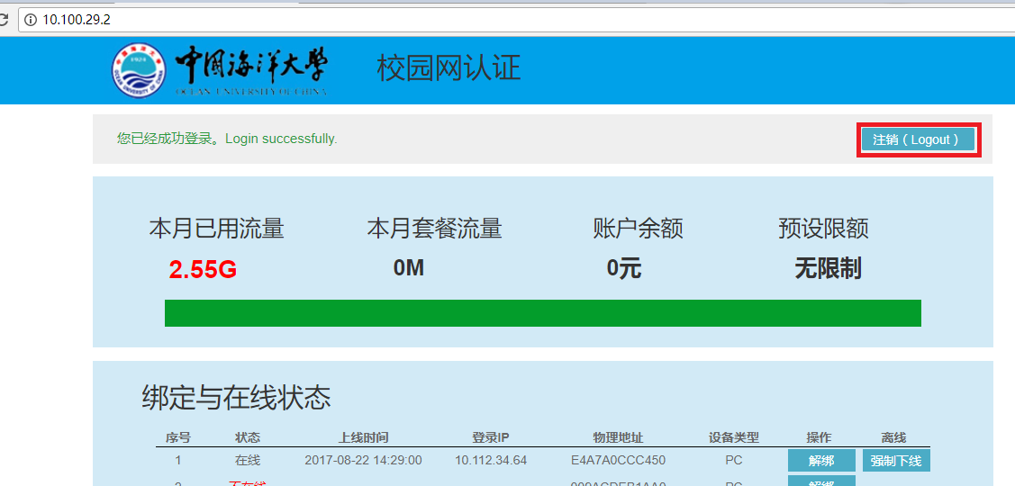 为避免流量浪费,使用流量上网用户请上网完成后及时进行账号注销操作。注销账号步骤:在浏览器输入:http://10.100.29.2,即可弹出登录成功页面,点击注销即可。如下图: