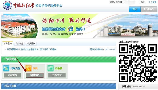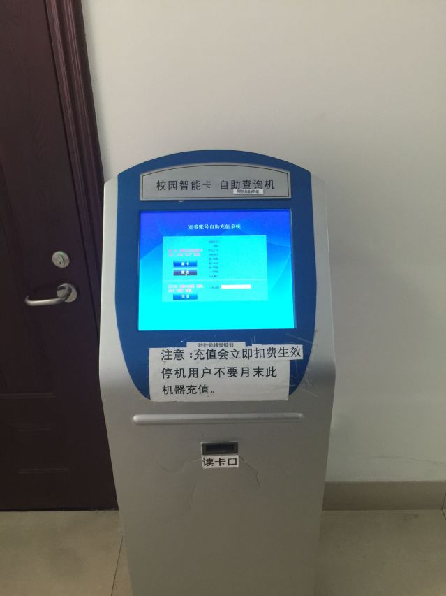 目前学校自助交网费设备共有两台,鱼山校区网信中心办公室以及崂山校区用户接待服务大厅外各一台。缴费流程如下: