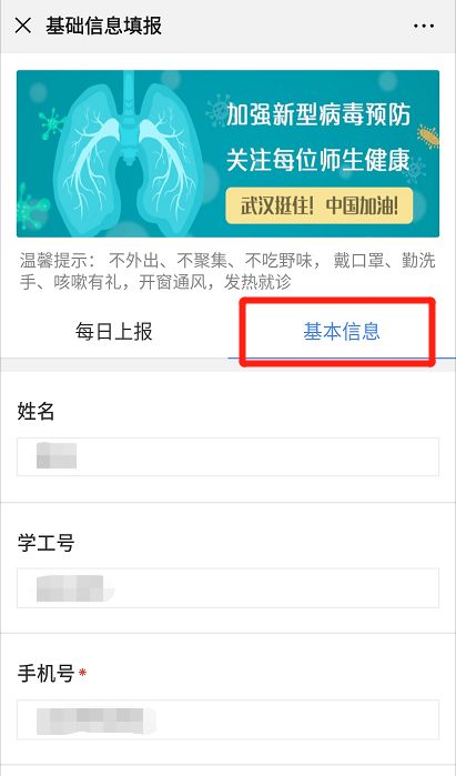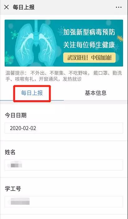 重要提醒:第一次使用完善“基础信息”后还需在“每日上报”报送当天信息。