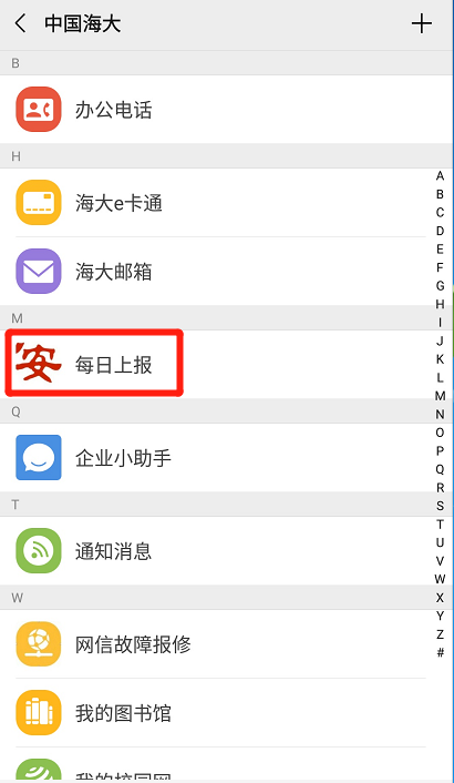 2.账号绑定成功后,从微信“通讯录”的“我的企业”中,进入“开云电竞app安卓版下载安装”微信企业号,选择“每日上报”进入“开云电竞网址疫情防控通”信息平台。