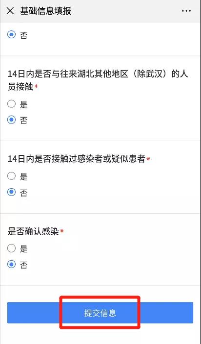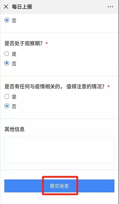 打开系统可见“基本信息”和“每日上报”两栏信息,其中“基本信息”填一次即可,“每日上报”需要每天填写。填写结束,点击“提交信息”即可。