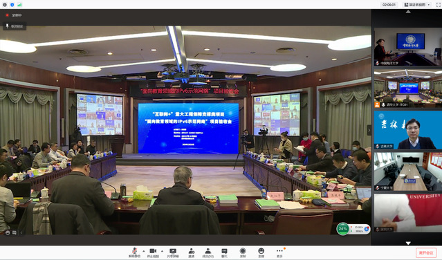本次验收会以现场和线上的两种方式同时进行,由教育部科技司主持,清华大学副校长、中国工程院院士尤政出席验收会并致辞,项目负责人CERNET网络中心主任、清华大学教授、中国工程院院士吴建平做了项目汇报,CERNET网络中心副主任、清华大学教授李星进行了项目演示,来自清华大学、赛尔网络有限公司的20余人现场参加了会议,我校及全国40所高校通过视频会议的形式参加了该项目的验收会。