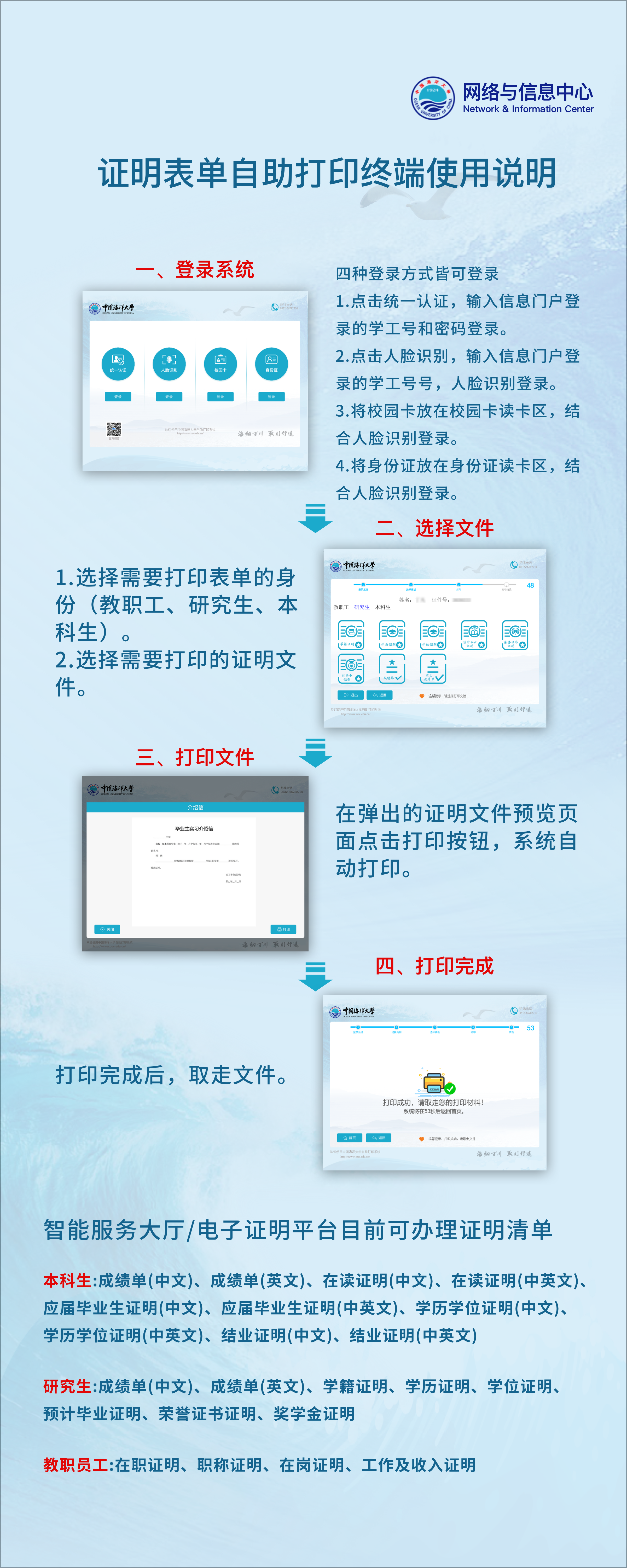 大厅配备三台自助证明表单打印机,师生可通过人脸、刷卡、统一身份认证等方式登陆电子证明平台,自助打印所需表单。