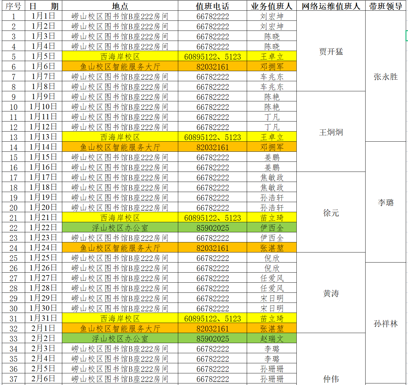 网络与信息中心2022年秋季学期寒假假期值班表