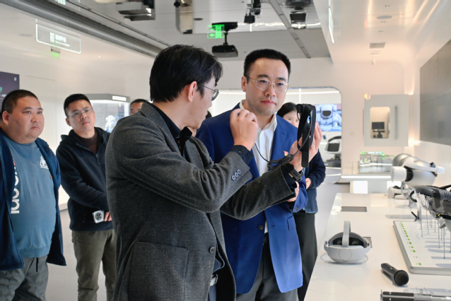 在国创中心市场商务部部长刘剑的引导下,党员们首先参观了主题展区,并沉浸式体验了虚拟现实(VR)、增强现实(AR)等前沿技术。通过生动的展示和互动,大家直观感受到了科技的蓬勃发展,进一步增强了民族自豪感和对科技创新的感悟