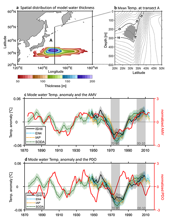 图:北太平洋副热带模态水的空间分布(a,b)及其温度变化与AMV(c)和PDO(d)的关系
