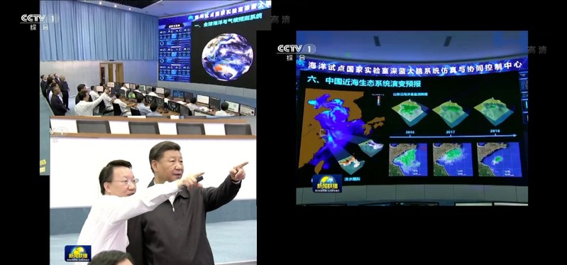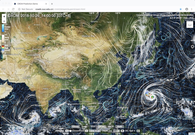 伴随建设模式和预测系统的过程,需要将模拟或预报结果准确而生动地提供给专业或非专业人士进行查阅和使用。这不但可以对科研工作起到很好的辅助作用,还是对科研成果的应用和宣传。基于Fortran、Python和JaveScript等程序语言和相关技术,开发了一套适用于数值模式数据的后期处理和展示的方法,不仅可以将模拟或预报的结果进行系列化的高质量成图展示,还可以把数值产品集成到网页进行可视化的人机互动,为有不同需求的人群提供参考,比如海洋科考人员可以实时查看天气形式和海况,科教人员则可以据此了解或展示天气系统或洋流结构等。在2018年6月青岛上合峰会期间,通过该可视化系统提供的素材,向国家主席习近平展示了地球模拟器系统(以全球耦合数值模式CESM为核心)、“两洋一海”区域预测系统以及近海环流及生态环境预报系统(以区域海洋模式ROMS为核心)的数值模拟成果(图1至图5),取得了非常好的效果。