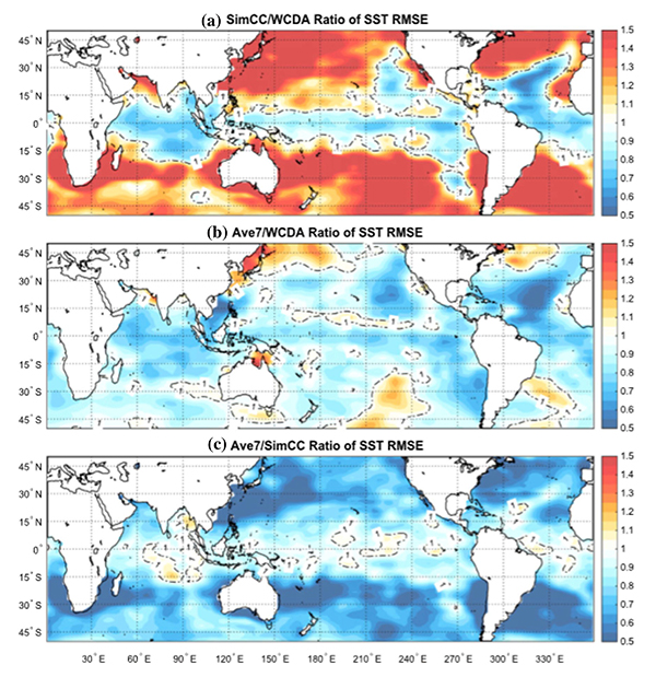 图:强耦合同化改善海表面温度模拟样例。负值为优于弱耦合同化(WCDA),b为使用7日大气Leading averaged coupled covariance的强耦合同化结果(SCDA)