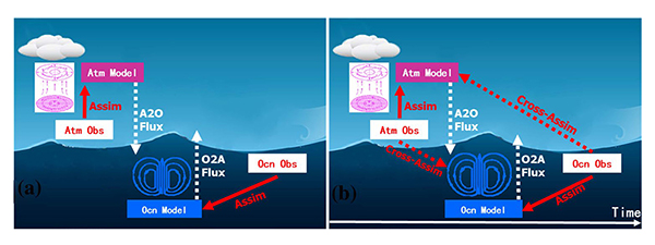 图:a弱耦合同化和b 强耦合同化及其实现方案示意图。a 弱耦合同化先用地球系统模式单一分量吸收相应分量观测信息(红实箭头)然后通过耦合界面通量传输(白虚箭头),b 除耦合界面通量传输机制,强耦合同化用不同模式分量之间的误差协方差直接投影观测信息到地球系统其它分量(红虚箭头)。白实箭头标示地球系统分量相互作用过程中可能存在的时间滞后(例如海洋对大气强迫的滞后响应)