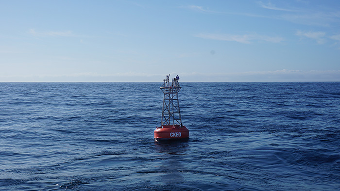 本航次计划前往的黑潮延伸体海区恰好位于大气锋面活动的高发区,气象条件和海况复杂多变,科考队员通过制定周密的工作计划,及时根据天气和海况调整工作方案,在“东方红3”船全体船员的通力配合下顺利回收了两套我国自主研发的CKEO(China Kuroshio Extension Observatory)系列大型浮标观测系统(图2),并对CKEO系列浮标进行了再次布放(图3)。相比之前海气界面的单一观测,此次重新布放的CKEO系列浮标完成了从气象要素到水文要素再到生化要素的扩展,实现了跨圈层(大气圈、水圈和生物圈)动力要素和生态要素的综合同步观测。
