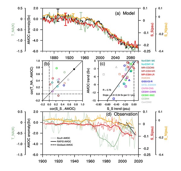 1 .a)(d)分别为模式集合平均和观测中的AMOC指数(黑线),北大西洋副极地SST指数(绿线),南(红线)北(橘红线)大西洋盐度指数的时间序列;(b)为CMIP5各模式中南大西洋盐度指数和北大西洋副极地SST指数与AMOC的年相关系数的比较;(d)为CMIP5各模式各模式里南大西洋相对盐度趋势和AMOC趋势的比较。