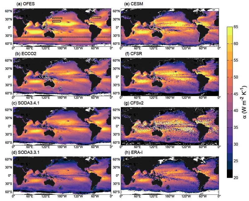 海洋中尺度涡旋与大气的相互作用会引起海气间的热量通量,从而耗散中尺度涡的势能。因此,中尺度海气相互作用是中尺度涡耗散的一个重要机制。然而,目前广泛使用的环流模式对中尺度海气相互作用模拟的好坏尚不明确。于是,我们评估了这些数值模式模拟的中尺度海气相互作用强度,发现模式之间存在很大的差异(图1)。在黑潮、南极绕极流等中尺度涡活跃的区域,差异能达到40%。通过进一步的分析,我们发现导致模式间差异的两个重要因素是海面风的强度和海气边界层对中尺度海气热通量的调整。在模式中,表面风速越强,中尺度海气相互作用强度越强。由于忽略了海气边界层的调整作用,纯海洋模式会高估20%–50%的中尺度海气相互作用。因此,海气耦合模式对中尺度涡的能量通路的准确模拟必不可少。该成果发表在Geophysical Research Letters上。