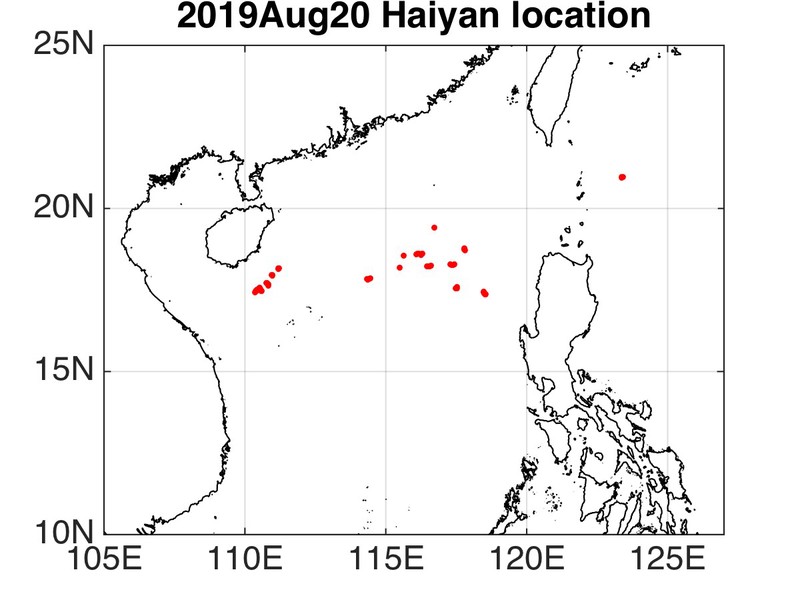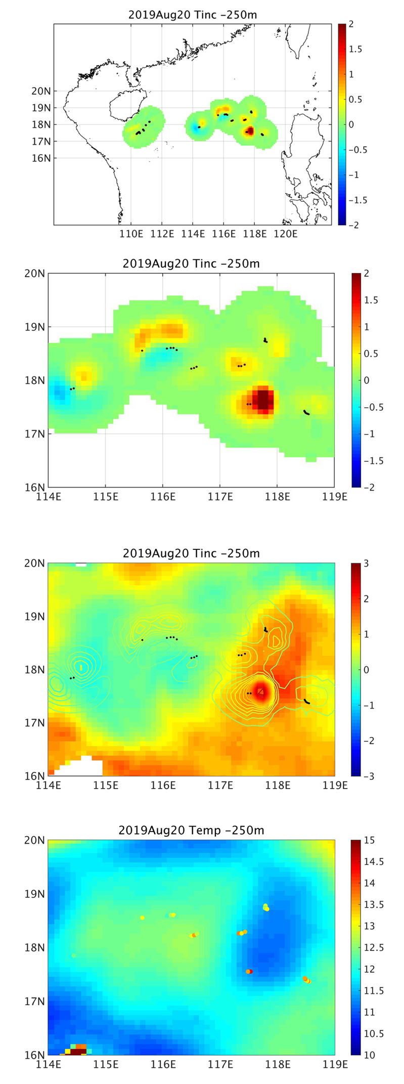 2019年8月20日,同化系统首次使用17台设备卫星回传的实时无人组网观测数据对延伸期预测系统初始场进行了同化修正。17台设备实时结果的分布如下图所示。其中部分设备位于海南岛以东,在2019年8月底回收,其它设备位于吕宋口西南。图3为使用实时观测数据进行同化的结果样例。四图都为250米深度,由上至下分别为,同化系统修正结果,同化系统修正结果局部放大,同化系统修正结果(等值线)与再分析与模式结果差异(背景色)的对比,模式结果(背景色)与海燕观测结果(彩色点)的对比。17台设备在空间分布上较为广阔,其修正结果与HYCOM和模式差异结果基本一致。在离观测数据位置较近的模式点上修正较强,稍远则修正逐步减弱直至为0。在18ºN, 114.5ºE处同化修正结果与HYCOM和模式差异结果反向;由模式结果与海燕观测的对比可知,海燕观测的250米温度在此点要高于模式结果,而HYCOM要低于模式结果,即是HYCOM结果与实时观测结果间存在一定差异,同化系统的修正符合延伸期系统结果与实时观测间差异而不符合系统与HYCOM结果间差异,同化系统工作正常。