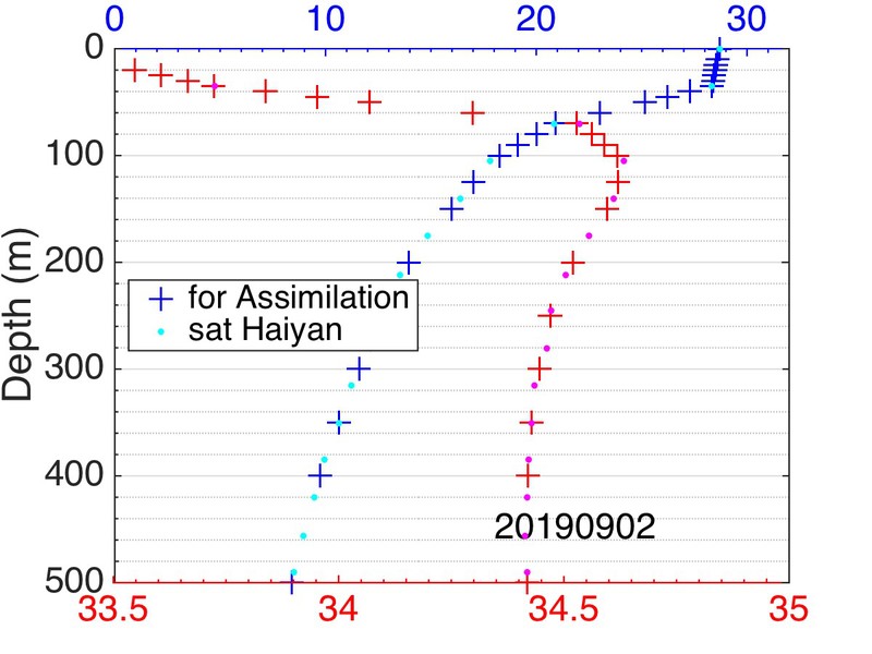 图:2019年9月2日实时回传数据天蓝色(温度)、紫红色(盐度)向当日同化分层插值的结果