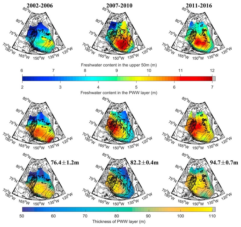 图:在50 m以浅的淡水含量(最上三幅小图)和在太平洋冬季水这一层内的淡水含量(中间三幅小图)以及层厚(最下三幅小图)在三个时期的分布和变化