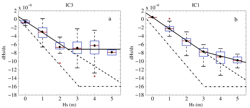 图:利用WAVEWATCH III模拟所得的有效波高的衰减率分布(箱须图)