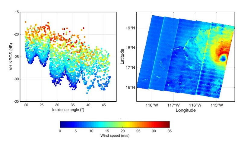 图:Sentinel-1A C波段合成孔径雷达VH极化后向散射系数随海面风速和雷达入射角的变化和热带气旋海面风速反演