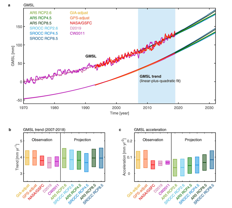 Figure. The observed and projected global mean sea level (a) time series [mm], (b) linear trends over 2007–2018 [mm yr−1], and (c) acceleration over the whole period of each dataset [mm yr−2]. Error bars indicate 90% confidence level.