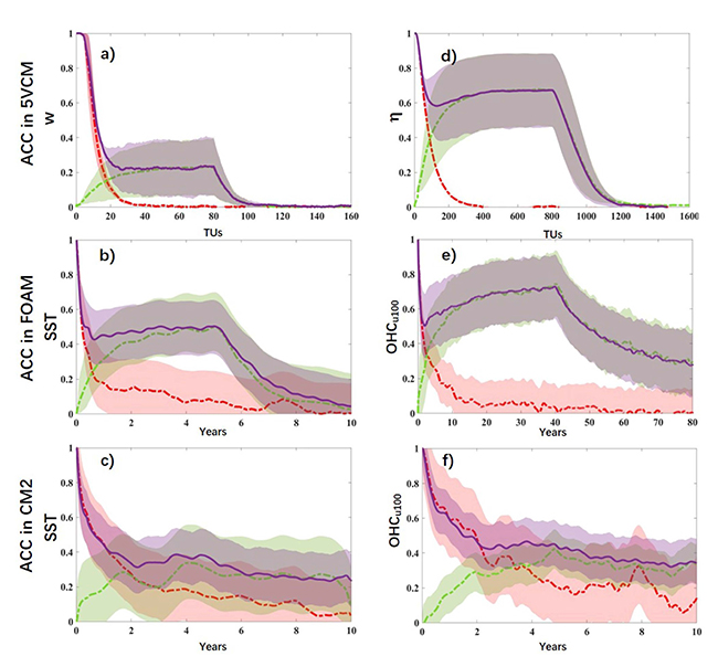 图:测量初值(红)边值(绿)和联合初边值(紫)可预报性的距平相关系数随预报时效增长的变化曲线及相应的标准差范围(阴影)。上、中、下分别为简单模式,粗分辨率和IPCC流行分辨率模式的结果,左边是海表温度(或为简单模式中的大气变量)、右边是上层100米海洋热容量(或为简单模式中的深海变量)距平相关的演变。