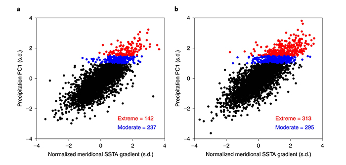 图1. 20世纪历史气候情景(a)和21世纪未来变暖情景(b)下大西洋ITCZ极端摆动事件(红点)。