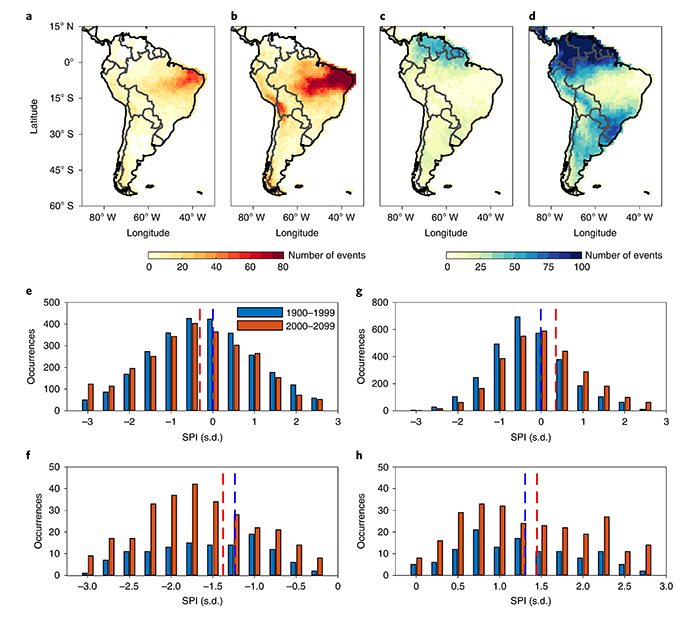 图2. 20世纪历史气候情景和21世纪未来变暖情景下,由大西洋ITCZ极端摆动事件所导致的极端干旱(a,b,f)和极端降雨(c,d,h)事件的发生频率直方图。