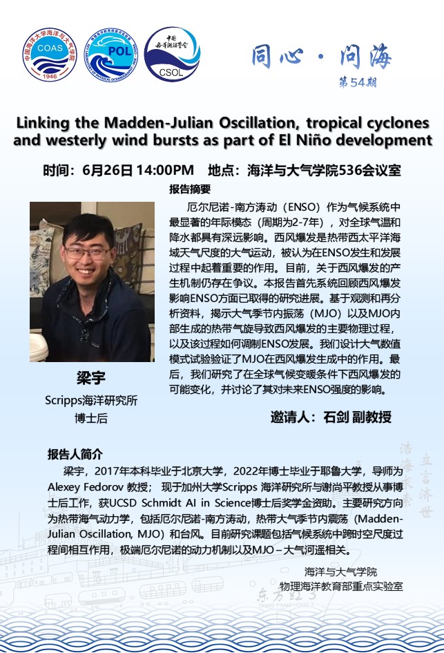 【同心•问海 主题沙龙 53-54】全球气候-陆面-水文过程及极端水文事件风险与中国适应研究/Linking the Madden-Julian Oscillation, tropical cyclones and westerly wind bursts as part of El Niño development