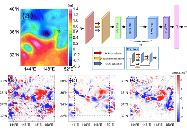 图1:(a)海表面高度场和深度卷积神经网络构架。(b)模式模拟输出的“真实”垂直流速场。(c-d)eSQG方法和深度学习模型的垂直流速场重构结果。
