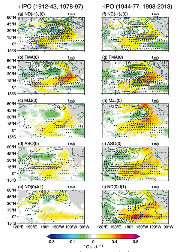 图1:(a-e)IPO正位相与(f-j)IPO负位相时春季NPMM指数回归的海表面温度、10米风场和海表面气压的季节演变。斜线阴影区域表示海温异常超过90%置信水平,图中只显示了通过置信水平的风场异常。