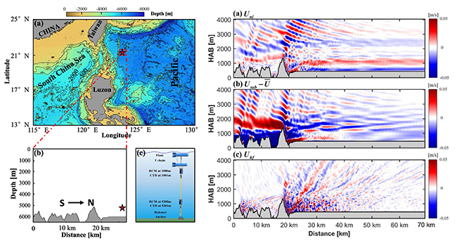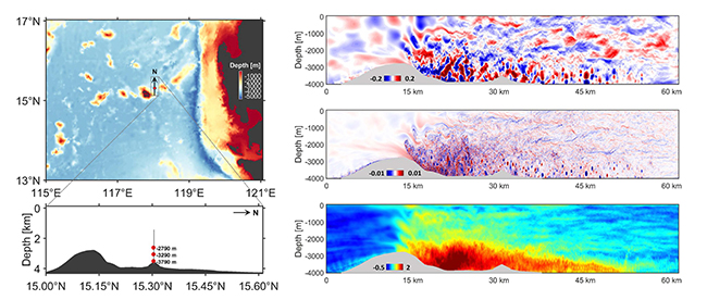右图:MITgcm模拟观测海域附近地转流与海山相互作用生成内背风波过程(Zheng et al., 2022)