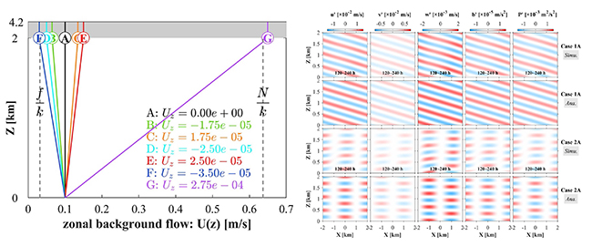 图3 左图:基于MITgcm模型的剪切背景流生成内背风波实验设计方案;
