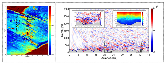 图1 左图: 德雷克海峡深海观测点分布(Nikurashin et al., 2014); 右图:高分辨率MITgcm模拟德雷克海峡地转流与地形相互作用生成内背风波过程(Zheng and Nikurashin, 2019)
