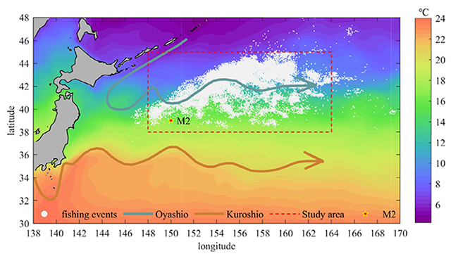 图1:2014 - 2020年我国渔船在西北太平洋海域捕捞柔鱼的作业位置。背景图为气候平均海表面温度。浅灰色点表示原始捕捞点,红星为西北太平洋黑潮延伸体定点观测阵列的M2潜标所在位置。